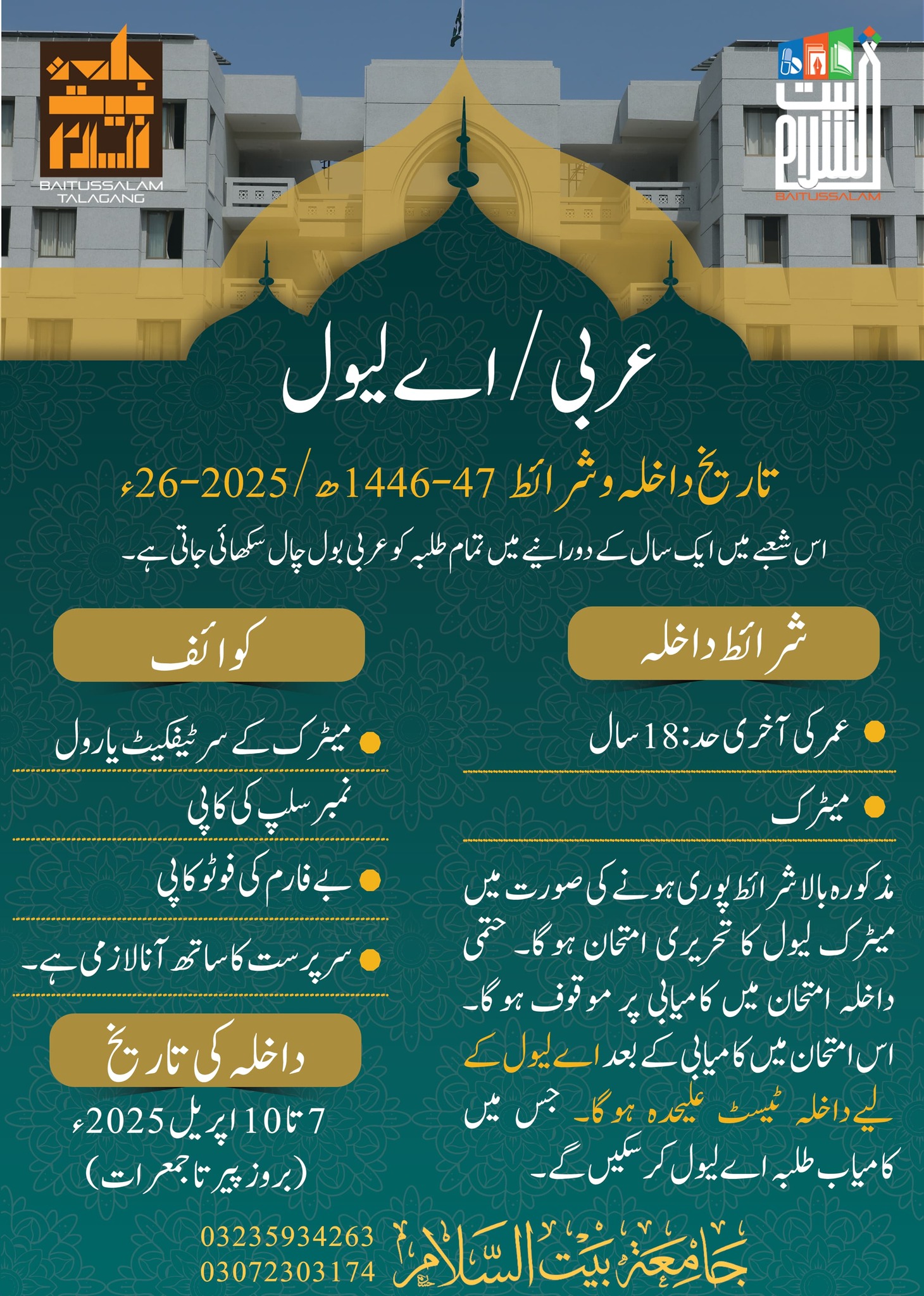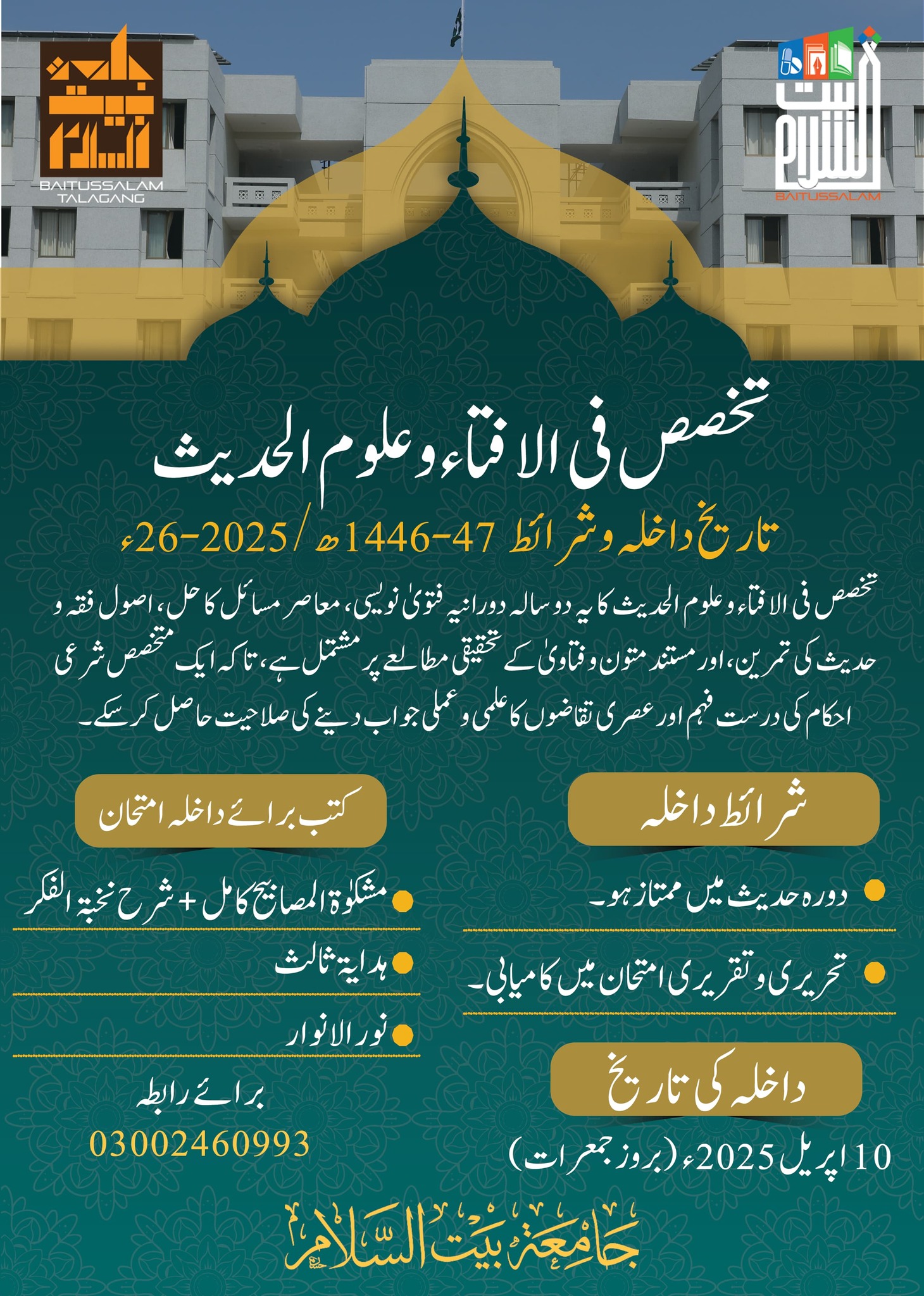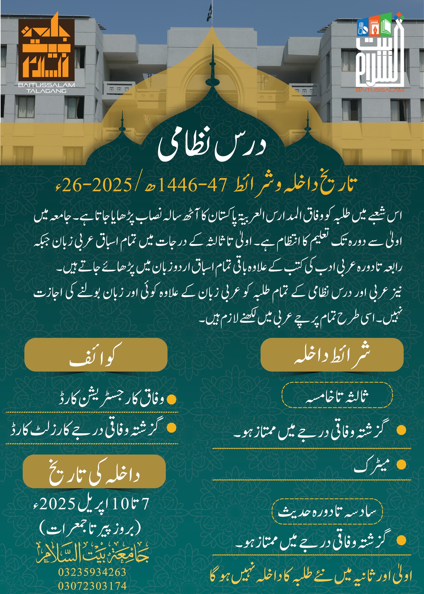 All interested candidates to obtain admission in Baitussalam Talagang should get a registration form. They can get admission forms from the admission branch and also online. Presently, Jamia Baitussalam is offering admission application forms free of cost. So it is a golden chance for admission seekers of Baitussalam Talagang admission 2025. The admission fee is none refundable and students have to deposit once.