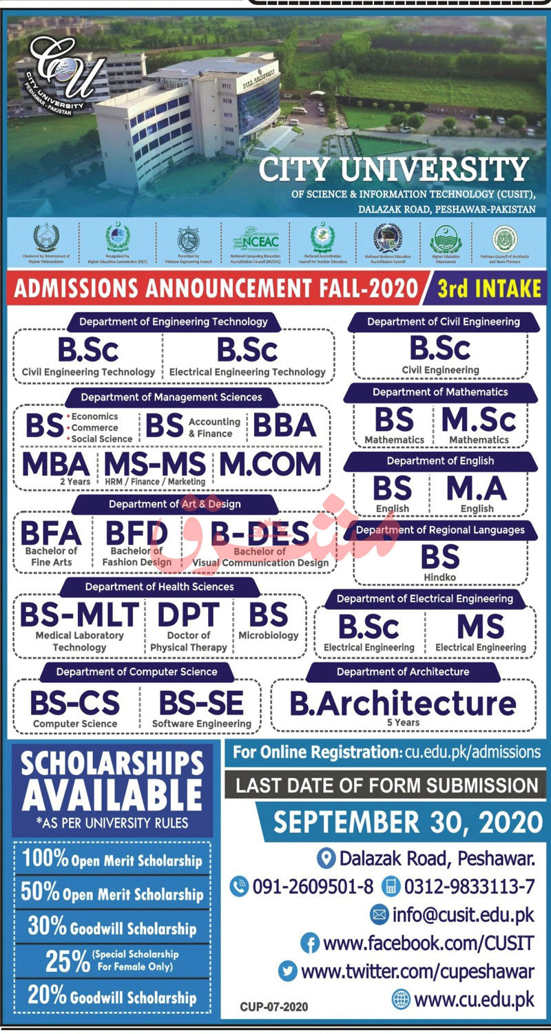 All interested candidates can download the online admission form, fee structure and advertisement from this page easily given below. The entry test merit lists and waiting lists are displayed simultaneously in premises of City University Peshawar.